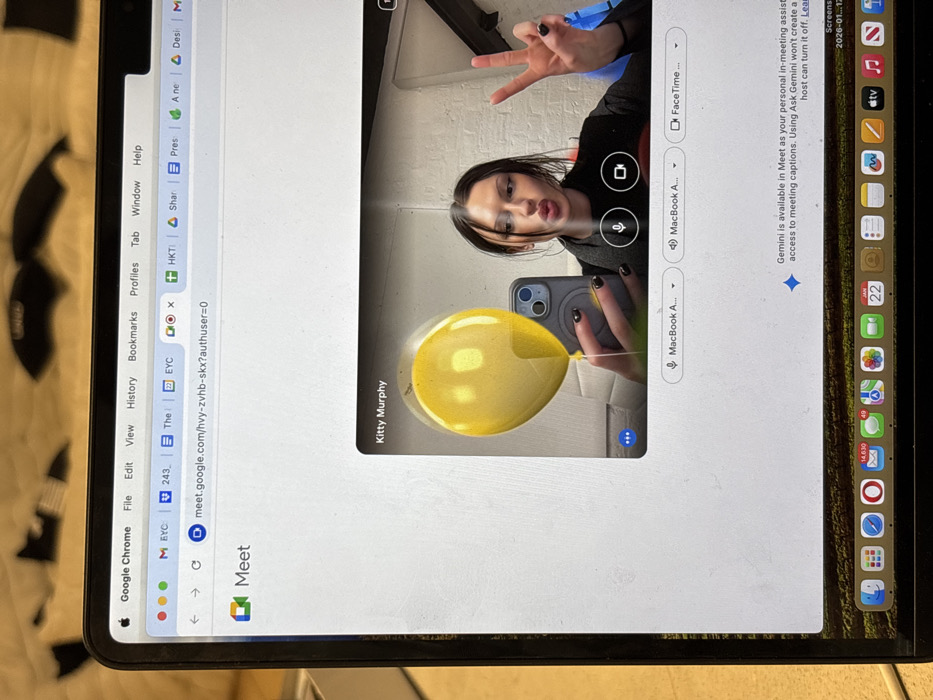 A laptop screen displays a Google Meet call. The Meet interface is open in a Chrome browser with tabs for "EYC," "The," and "HKTI." The Meet window shows a person, identified as "Kitty Murphy," holding a phone with a yellow balloon filter. Below the video are options for "MacBook Audio" and "FaceTime." The screen's dock displays icons for Mail (14,630 unread), Messages (49 unread), and Calendar (22 notifications). A notification for Gemini in Meet is also visible. The macOS version is visible, with an apparent expiration date of January 12, 2026.