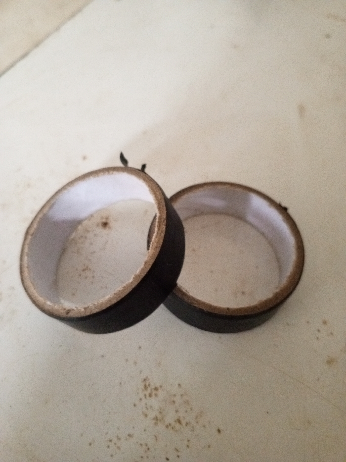 Two rolls of dark-colored adhesive tape, likely black electrical tape, rest on a light-colored, soiled surface