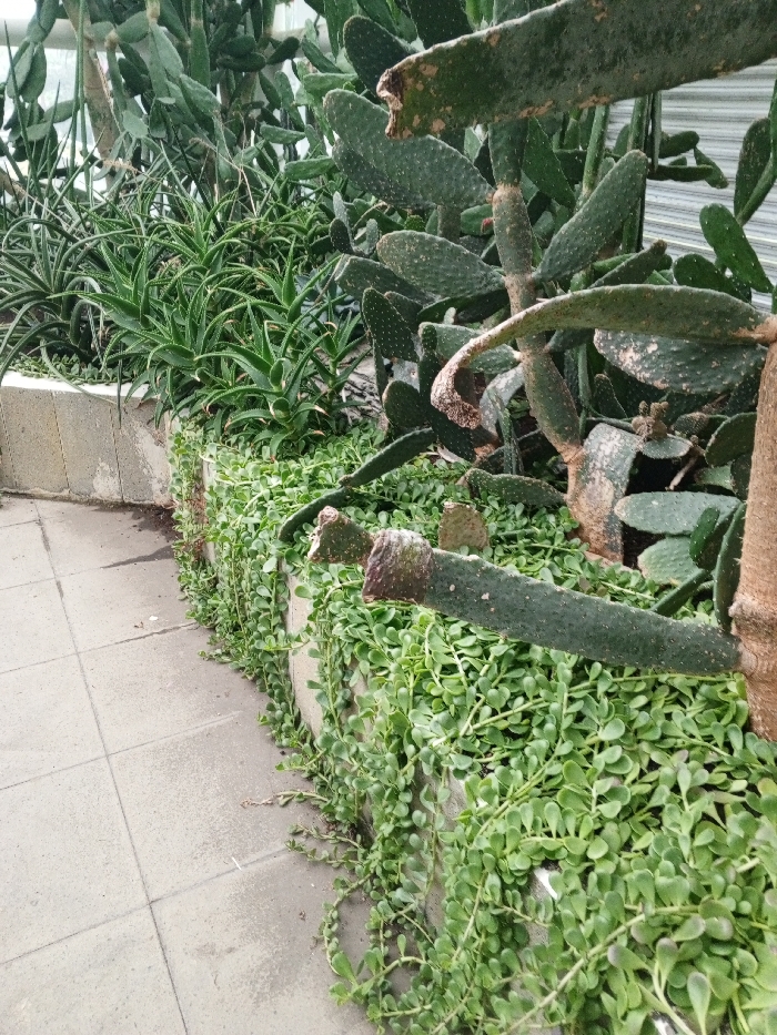 A diverse collection of cacti and succulents occupies a raised planter. Prominent are the flat, paddle-shaped segments of a prickly pear cactus, interspersed with spiky aloes. A cascade of small, rounded green leaves spills over the edge of the planter, creating a lush ground cover. The planter's concrete edge contrasts with the vibrant greenery. Light filters through what appears to be a greenhouse environment, illuminating the varied textures and forms of the plants.