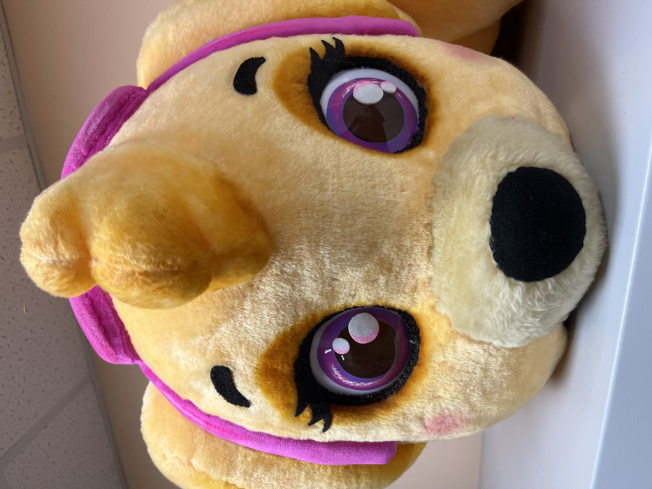 - "The image displays a large, plush head resembling the character Skye from Paw Patrol, resting on a white, flat surface in an indoor setting" by FM-XlCcP2, licensed under CC BY 4.0