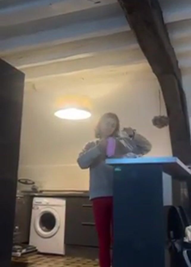 A young woman with long, wavy brown hair is standing in a kitchen with red leggings, a grey long-sleeve shirt, and white socks