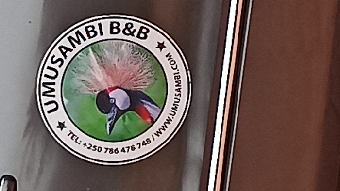 A circular sticker is affixed to a dark gray or black vehicle panel, likely a car door, visible in the upper center of the frame. A horizontal chrome trim line runs below the sticker. The sticker features a white outer ring with black text: "UMUSAMBI B&B" at the top, and "TEL: +250 786 478 748 / WWW.UMUSAMBI.COM" at the bottom. Two small black star symbols separate the text segments. The central part of the sticker displays a detailed illustration of a Grey Crowned Crane's head in profile, facing left, against a green background. The crane exhibits its distinctive black head, white cheek patch, red gular sac, and prominent golden-brown crest. No individuals are present in the image. The vehicle is located in Kigali City, Rwanda.