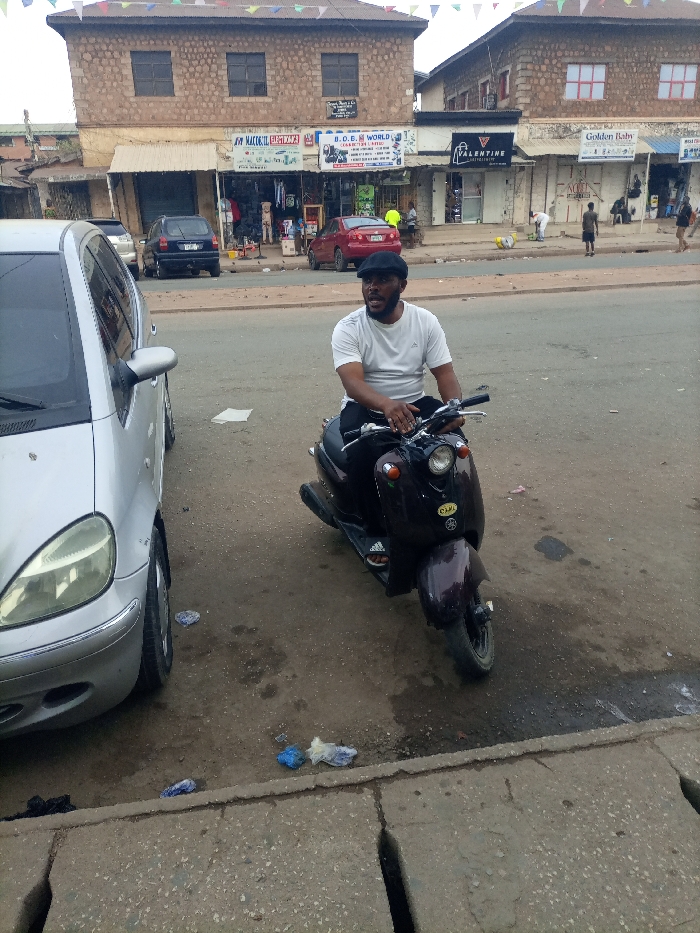 An adult male sits on a dark purple scooter parked on an asphalt street in an urban commercial area. He wears a white t-shirt, dark trousers, black flat cap, and striped sandals, with a beard and his mouth slightly open, looking towards the left. A silver Mercedes-Benz A-Class (W168) is parked to his left. Behind him, across the street, a row of two-story stone-faced buildings houses multiple businesses with prominent signage, including "J.M. MACOCHILL ELECTRICALS," "D.D.E. WORLD," "VALENTINE," and "Golden Baby." Additional vehicles, including a black SUV and a red sedan, are parked further down the street. Multiple pedestrians are visible near the shops. The immediate foreground includes a concrete curb with a drainage channel and scattered litter. Small decorative flags are strung between the buildings. The sky is overcast. The location is an unnamed street in Unknown, Unknown.