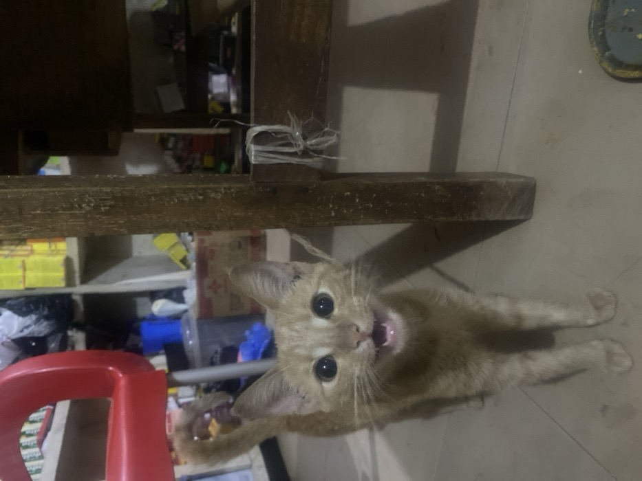 An orange tabby cat stands upright, gazing directly at the camera with its mouth open in a yell or meow. It's positioned beneath a wooden table leg with twine tied around it. A red plastic chair is partially visible to the left. In the background, there are various items on shelves. The floor is a light beige color. The photo is taken from a high-angle perspective.