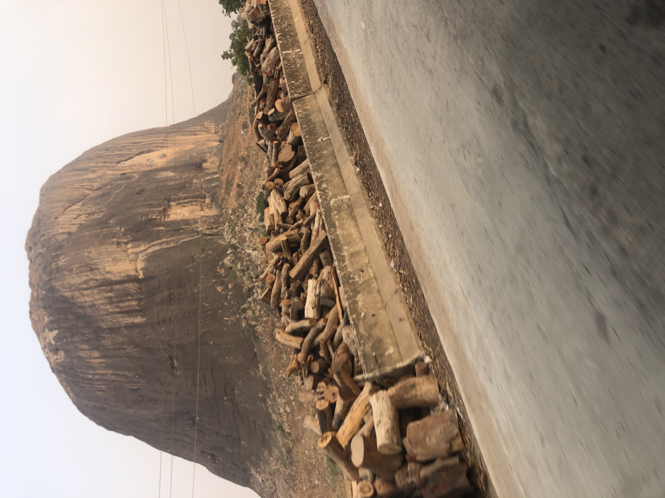 A gray road surface fills the right of the frame. A concrete curb separates the road from a collection of logs piled along the curb. To the left of the wood pile is a large, rocky landform, possibly a mountain or large hill. Some greenery is visible near the top and base of the landform. Thin lines, likely power lines, run from the top of the landform toward the sky. The sky appears hazy or overcast.