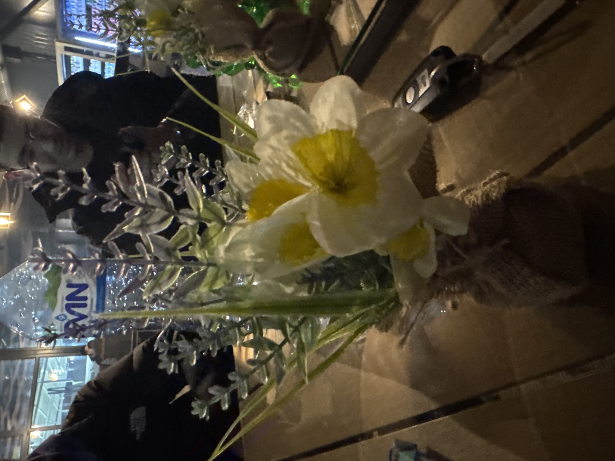 The image captures an indoor scene within a commercial or public establishment in an undisclosed location in Unknown, Unknown. In the foreground, a small artificial floral arrangement is centered, featuring white and yellow daffodil-style flowers along with green and light purple foliage, contained within a burlap-wrapped pot. This arrangement rests on a textured, light brown surface, likely a wooden table. To the right of the floral display, a black car key fob with an attached metallic key is visible on the same surface. In the midground, a clear plastic water bottle with a partially visible blue and green label (displaying "VIN" or "OMIN") is positioned behind the floral arrangement. A faint reflection of the foreground elements is present on a surface behind the bottle. To the right, a second, smaller, similar burlap-potted floral arrangement is partially visible. The background reveals parts of an interior space. On the far left, the left arm and shoulder of an individual wearing a dark jacket with a white logo are visible. In the center-right, an out-of-focus person with dark hair and glasses is seen looking downwards, appearing to interact with a handheld device. Another individual is dimly visible further in the background through what appears to be a glass partition. The environment includes glass partitions or windows, artificial lighting fixtures (including overhead lights), and illuminated displays, indicating an ambient, possibly evening, setting. No direct interactions between individuals are discernible.