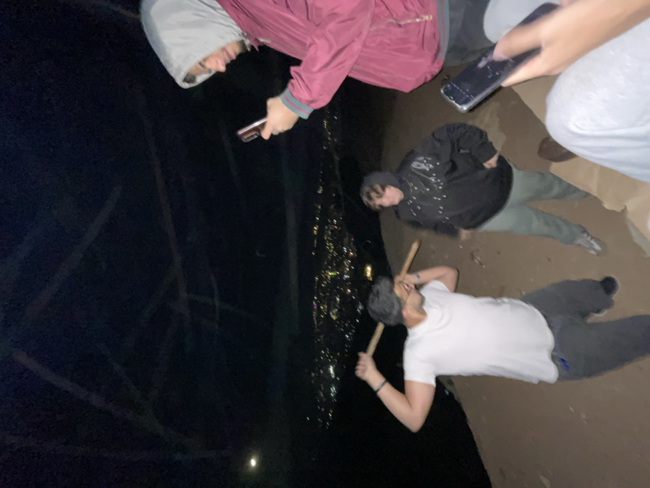 At night, an elevated outdoor scene in Dummar Municipality, Syria, depicts four individuals on an unpaved surface overlooking a city illuminated by distant lights. In the left-midground, a male wearing a white t-shirt and dark pants holds a light-colored wooden stick with both hands raised above his head, as if preparing to strike. He wears eyeglasses and a dark bracelet on his left wrist. To his right, a second individual in a dark hooded sweatshirt with white markings and light-colored pants stands facing towards the left. In the right-midground, a third male in a maroon hooded jacket and dark pants is engrossed with a smartphone held in his right hand. Partially visible in the immediate foreground, a fourth individual's lower body in light-colored pants is seated, holding a smartphone. The background features a blurred cityscape below, punctuated by numerous artificial lights. A visible moon hangs in the upper-left sky, and faint, angular structural elements are discernible against the dark expanse above the city.