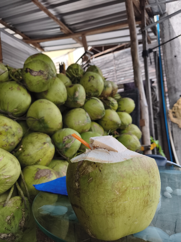 A vibrant green coconut sits on a glass-topped surface, partially covered in small, smooth white stones. It has a straw inserted and a piece of coconut meat sits on top. In the background, a large pyramid of similar coconuts rises, creating a tropical marketplace scene under a corrugated metal roof. A blue object is also present on the table under a few coconuts. The lighting is soft, adding to the refreshing feel of the image.