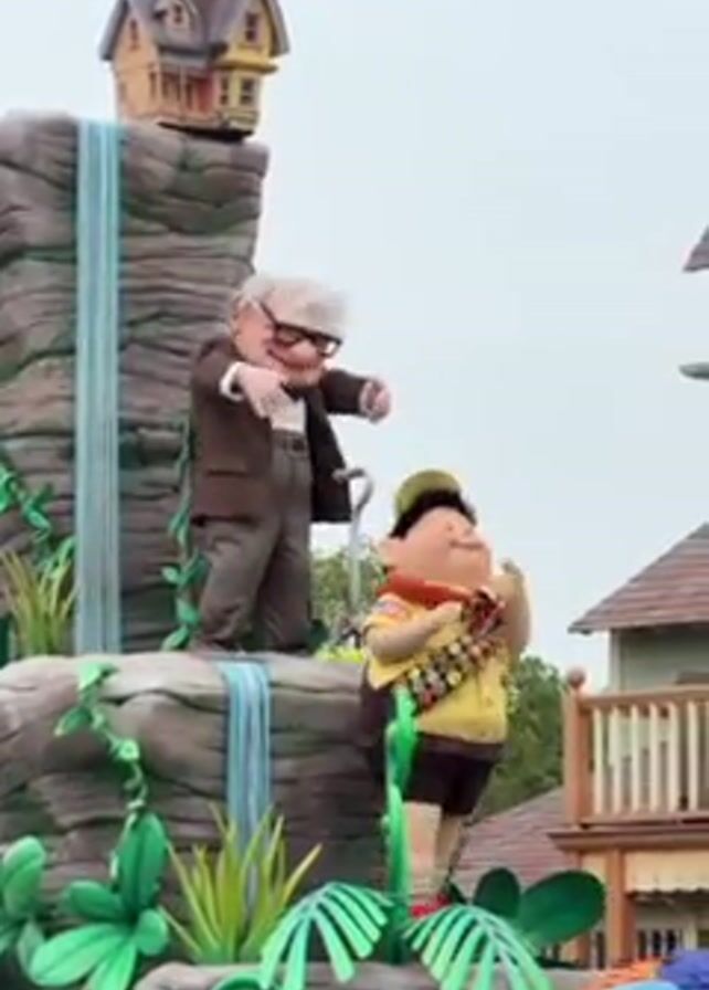 A daytime shot captures figures of Carl Fredricksen and Russell from "Up" on a parade float