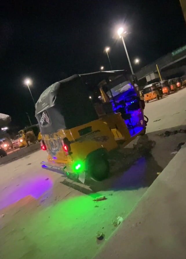 yellow three-wheeled vehicle, known as a "Keke" or auto-rickshaw, parked at night. It's decorated with green, blue, and purple neon lights. Other similar vehicles are visible in the background, illuminated by streetlights. The ground is concrete and shows signs of wear. The scene appears to be a parking area or terminal for these vehicles.