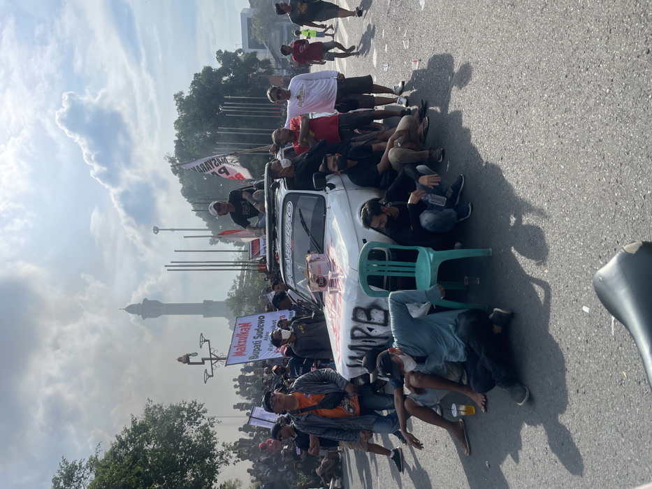 The image captures a daytime public demonstration on an asphalt road in Pati, Indonesia, specifically near the Monumen Adipura Pati, which is visible as a tall, slender white structure in the background under a partly cloudy sky