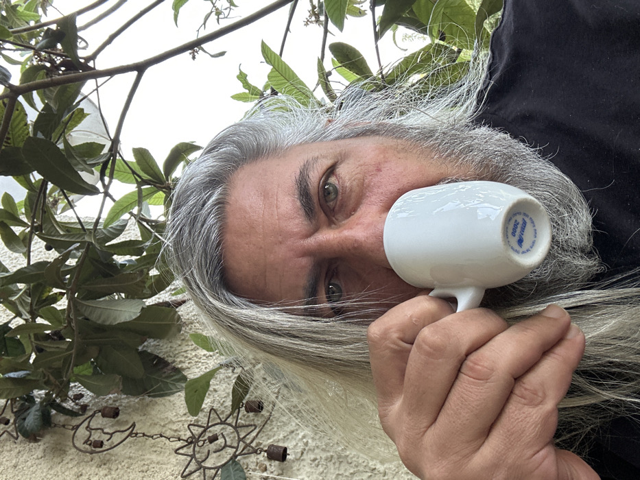A male individual with long gray hair and a gray beard is depicted in a close-up shot, holding a small white ceramic cup to his mouth as if drinking. His green eyes are directed forward. He wears a black shirt. The bottom of the cup displays a partially visible blue logo with "2000 miraal" text. In the background to the left, a light-colored textured wall is visible, adorned with a hanging rustic metal decoration featuring a smiling sun, a crescent moon, and small bells. Extensive green foliage and tree branches occupy the background to the right and above, set against a bright, overcast sky. The scene is located in Beit Yitshak Sha'ar Hefer, Israel.