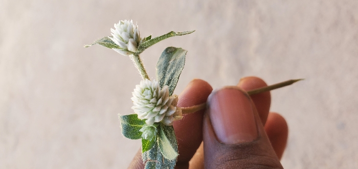 A dark-skinned human hand holds a small herbaceous plant against a uniformly out-of-focus, light beige background. The hand, specifically the thumb, index, and middle fingers, grasps the plant's stem from the lower left. The plant exhibits two distinct spherical to ovoid inflorescences, composed of numerous tightly packed white florets, approximately 1.5 cm and 1 cm in diameter, respectively. A third, smaller developing inflorescence is visible near the larger one. Several small, green, slightly hairy or dusty leaves are attached along the stems. The stems are slender and green-brown, with one terminating in a pointed tip extending towards the bottom of the frame. The scene takes place in an uncultivated area, such as a residential backyard, park edge, or vacant lot within Dallas, Texas, United States.