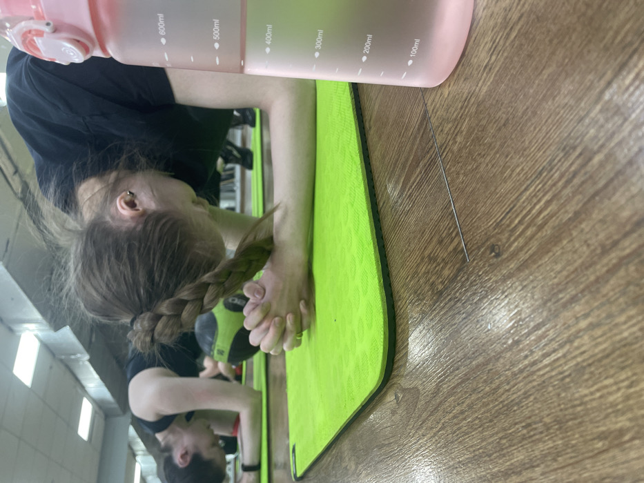 The scene depicts an indoor fitness facility in Izhevsk, Russia, characterized by a wooden plank floor and fluorescent overhead lighting. In the immediate foreground, a semi-transparent pink water bottle stands upright on the right, containing liquid at approximately the 450ml mark, with volume indicators visible (100ml to 600ml). A thin, metallic rod or wire, approximately 12-15 centimeters long, lies horizontally on the wooden floor between the water bottle and a bright green exercise mat. The primary subject, a female individual, is positioned centrally, engaged in a forearm plank exercise on the green mat. She wears a dark short-sleeved top, and her light brown hair is styled in a single braid extending over her right shoulder. Her hands are clasped together at the front of the mat, supporting her posture. A small, circular, metallic earring is present on her visible left earlobe. Behind the primary subject, at least two other individuals are discernible, also performing similar plank exercises on separate green mats. One individual to the left is partially visible, wearing a dark top and a fitness tracker on their left wrist. A black and green medicine ball rests on the floor between the main subject and the individual to her left. The background wall or mirror surface reflects portions of the room and additional obscured figures.