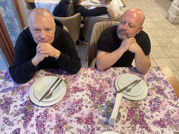 The image displays an indoor dining scene within an establishment located in the city of Podostrog, Montenegro. Two adult males are seated at a rectangular table in the foreground. The table is covered with a light-colored tablecloth featuring a repeating pattern of purple and pink lilac flowers. The male on the left is light-skinned, bald, and has a light beard. He is wearing a black long-sleeved top and is looking directly towards the viewer, with his hands clasped and resting under his chin. A place setting consisting of two stacked white plates, a knife, and a fork is positioned in front of him. The male on the right is also light-skinned and bald, with a darker beard. He is wearing a black short-sleeved top, revealing tattoos on his right arm. He is looking downwards and to his right, with his hands clasped under his chin. A similar place setting is in front of him. Between the two men, on the tablecloth, are a silver-toned salt and pepper shaker set and a stack of white paper napkins. In the background, partially visible, are other patrons, including at least one child with dark hair, seated at other tables with upholstered chairs. The floor is tiled with light-colored square tiles. Elements of the wall include a section of what appears to be stone or plaster on the right and a window area on the left showing an indistinct exterior view.