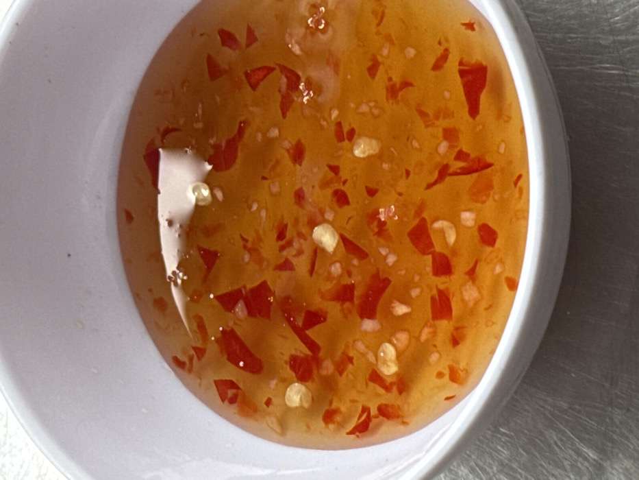 A small white bowl is filled with sweet chili sauce