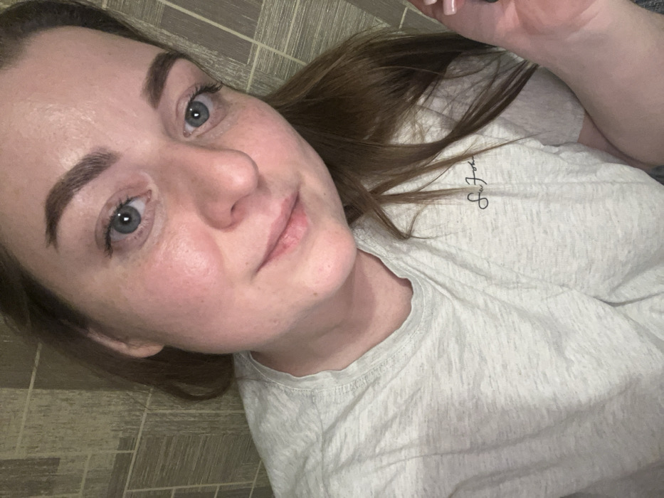 The image displays a close-up, high-angle indoor photograph of an adult female