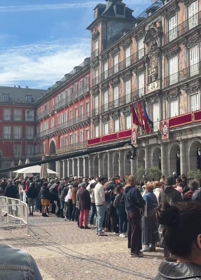 bustling scene in a European town square, likely in Madrid. People are gathered in large numbers, some waiting in line behind metal barriers. The square is surrounded by tall buildings with architectural details like windows, columns, and a central clock tower. A woman is seen looking at her phone, while others are walking around. A man is standing alone holding an accordion. The weather appears sunny and the atmosphere is lively.