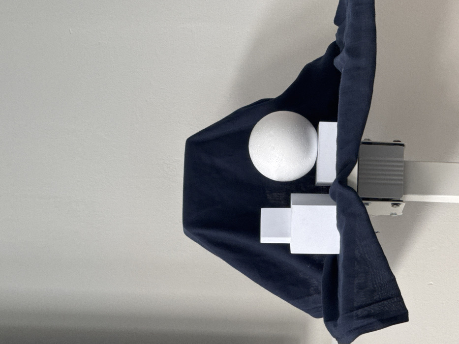 The image depicts a static still life arrangement on a white metal stand partially covered by a dark blue fabric against a plain, light grey wall. In the central area, a dark blue cloth is draped over an unseen object or stand, forming a backdrop and a surface for the displayed items. On the left side of the cloth, two white, smooth, opaque cubes are stacked vertically; a larger cube forms the base, with a smaller cube positioned directly on top. To the right, a white, textured, opaque sphere rests on a single white, smooth, opaque cube. The scene is illuminated by soft, diffused light, casting subtle shadows on the objects and the folds of the fabric. No people are present. The location is an indoor setting, specific room unidentifiable, in the city of Unknown, Unknown.