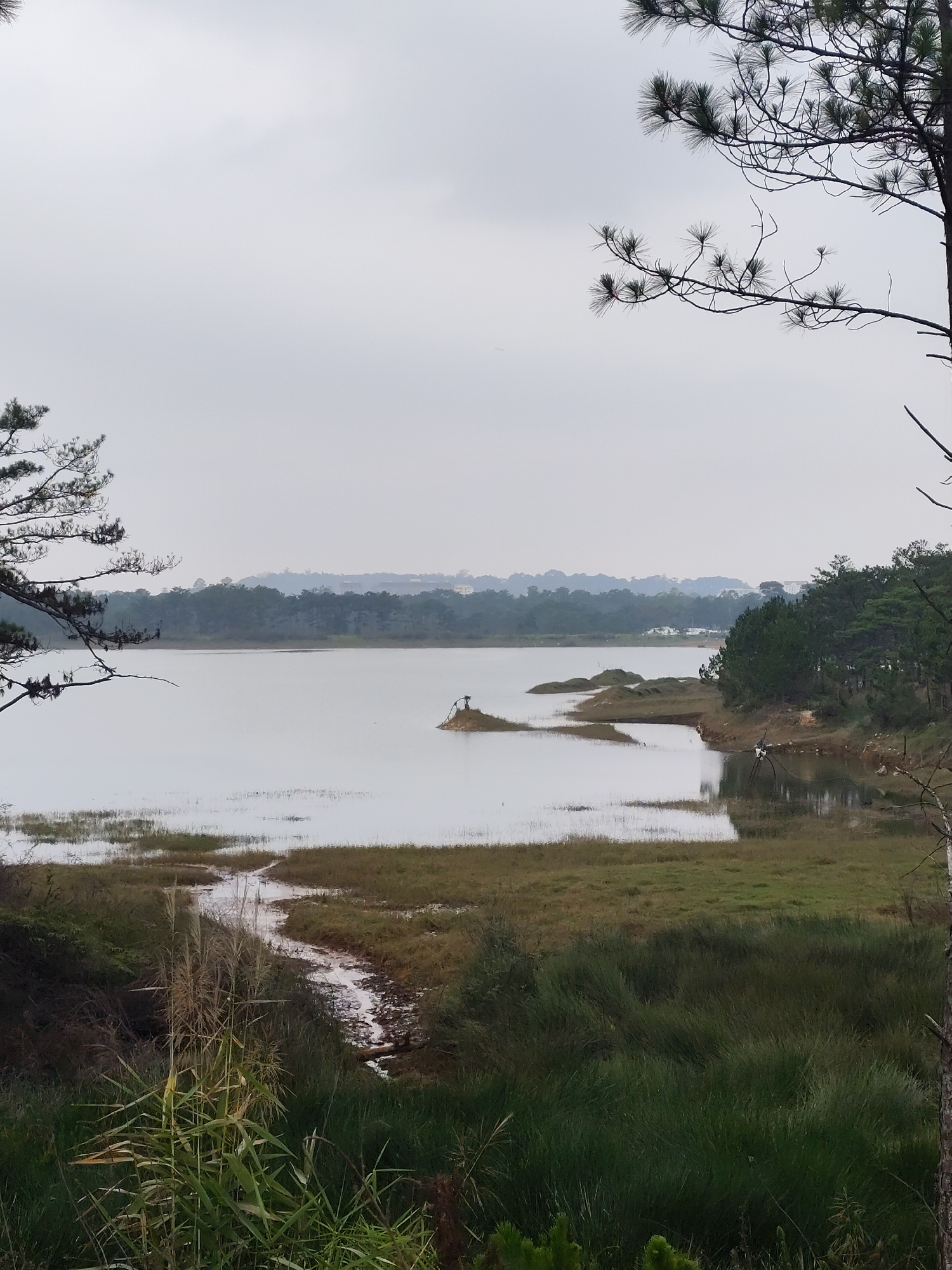 A landscape scene depicts a tranquil lake surrounded by lush greenery, situated in the Lam Vien - Da Lat region of Vietnam. The lake's surface is calm and reflects the overcast sky, which suggests a cool or potentially misty atmosphere. Patches of marshland and grassy areas border the lake, interspersed with a variety of trees, including prominent pine trees along the shoreline. A small island is visible within the lake. In the foreground, reeds and other vegetation grow, adding depth to the composition. The absence of people or animals in the immediate foreground emphasizes the serenity of the scene.