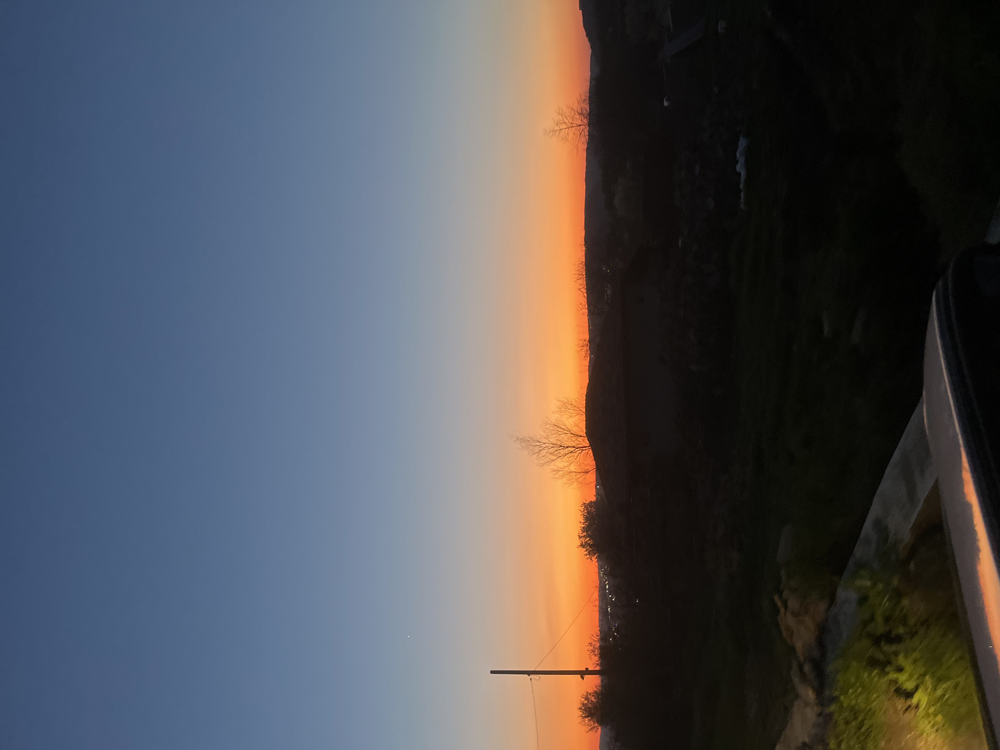 The image depicts a vertical view of a sunset landscape. The sky transitions from blue on the left to orange and red towards the horizon. A silhouette of a hilly landscape with trees and sparse vegetation is visible on the right. The image appears to be taken from a roadside, evidenced by a glimpse of the vehicle interior in the bottom right corner. There is a solitary pole with wires extending from it. The scene is located near Malki Chiflik, Bulgaria, based on the presence of characteristic terrain and vegetation. There are no people visible in the image. The absence of distinct artificial lighting suggests it is twilight.