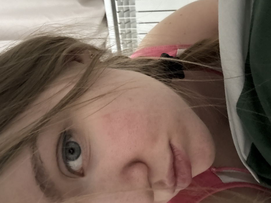 A close-up, angled shot captures a fair-skinned person with light brown hair. An eye, predominantly blue-gray, gazes towards the left. The face shows some redness on the cheek. Black hair tie is seen. A pink strap and white and green fabric appear behind the head. Blinds are slightly visible in the background.
