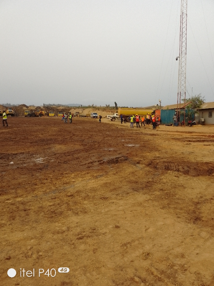 A muddy construction site under a cloudy sky features heavy machinery like bulldozers and trucks in the background. A group of workers in vests cluster near a yellow water truck and a blue container next to a communications tower. The foreground is a large expanse of churned earth.