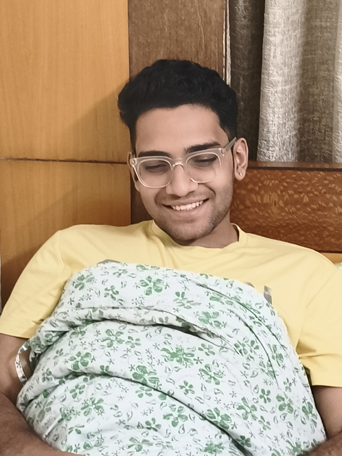 The image captures a young adult male inside a residential location in Kolkata, India. He has short, dark hair and wears clear-framed glasses, with a small stud earring in his left ear. He is dressed in a yellow short-sleeved t-shirt and covered from the chest down by a light green and white floral-patterned blanket. The subject is smiling broadly, with his gaze directed slightly downwards. The background consists of light brown wooden paneling behind him, and a textured, light-colored curtain or fabric visible on the right side of the frame.