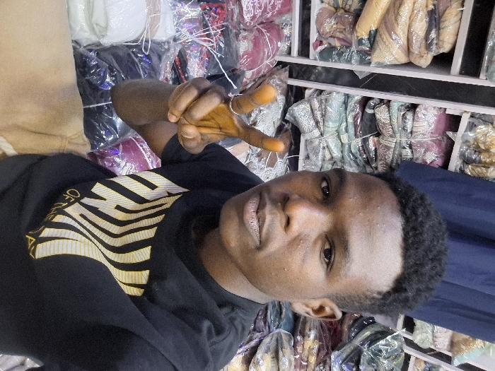 A young male subject, identified as being in Fagge A, Nigeria, is centrally positioned, facing the viewer directly. He holds his left hand elevated, displaying a "V" gesture with his index and middle fingers. The subject has dark, short, curly hair and wears a black short-sleeved t-shirt with a gold-colored, wavy graphic design. Portions of light-colored lower garments are visible below his waist. The background reveals a retail environment, specifically shelves densely stacked with numerous textile items, such as clothing or fabrics, individually encased in clear plastic packaging. These items display varied colors and patterns. The scene is illuminated by artificial light, characteristic of an indoor commercial establishment.