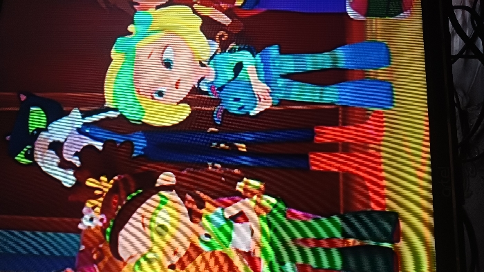The image displays a photograph of a television or monitor screen, exhibiting prominent diagonal scan lines, located in the city of Kasansay, Uzbekistan. The screen shows an animated scene featuring four cartoon characters within an indoor environment characterized by dark red walls and a horizontally striped floor with yellow and orange tones. From left to right: 1. A bipedal character, predominantly green with white and red stripes, wearing a multi-colored hat adorned with brown antler-like structures. Its left arm is slightly raised. 2. A tall, slender character in dark blue clothing and red boots. A small white creature, resembling a mouse or ferret, is positioned at its chest. Above this character's head, a black cat-like silhouette with glowing green eyes is visible. 3. A blonde-haired girl, dressed in a light blue-green striped jumpsuit, holds a small blue animal, possibly a rabbit or plush toy, close to her chest. Her facial expression conveys concern or surprise, with wide eyes and a slightly open mouth. 4. A partially visible character on the far right, showing a segment of red and green attire. The characters are standing, appearing to observe or react to an unseen event within the animated narrative.