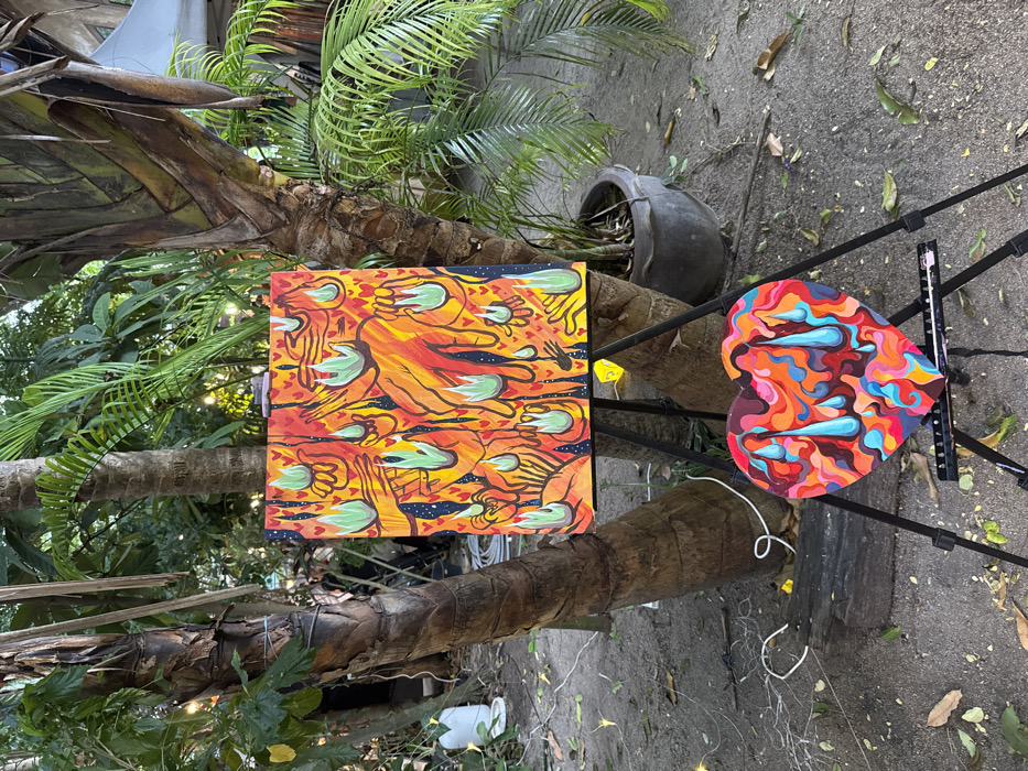 An outdoor scene in Moo 1, Thailand, displays two artworks on a black metal tripod easel. The upper, rectangular canvas depicts an abstract pattern of stylized hands, some holding light green flame-like forms, against a vibrant red, orange, and yellow background with small black elements and red hearts. Positioned below is a heart-shaped painting featuring abstract swirls of red, orange, blue, pink, and brown, highlighted by multiple light blue teardrop shapes. The setting is characterized by large trees with thick, brown trunks and dense green foliage, including palm fronds. The ground is dark earth or gravel, scattered with dry leaves. Visible environmental elements include a white power cord on the ground, a dark planter pot containing a plant, and a partial view of a white tent structure with string lights in the background. No individuals are present.
