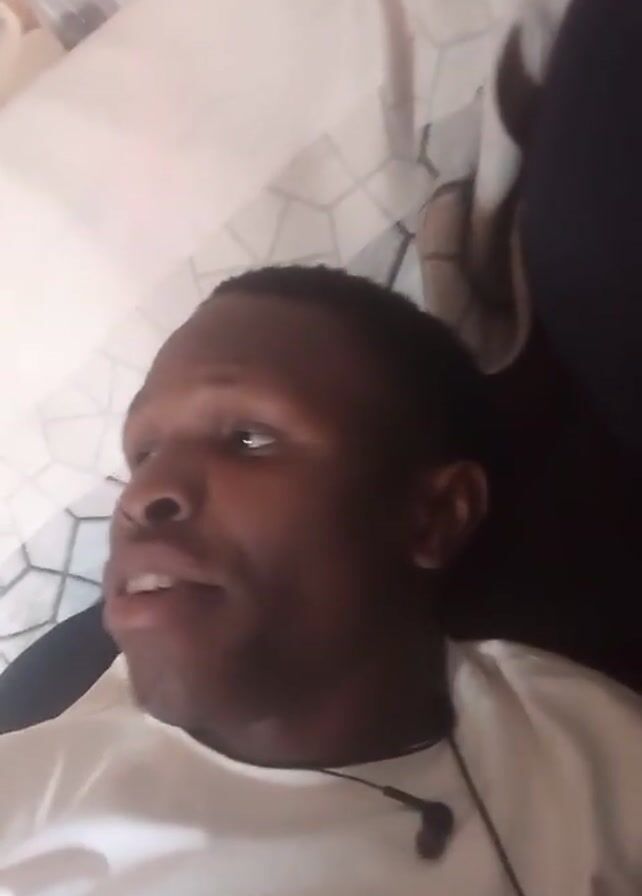 A man is lying down looking up towards his left side. He has short dark hair and is wearing a white t-shirt with dark writing on it. He has a dark cord coming from under his shirt and up to his right ear. The background shows a white and gray patterned blanket, a dark chair, and some items on a surface behind the man’s head.
