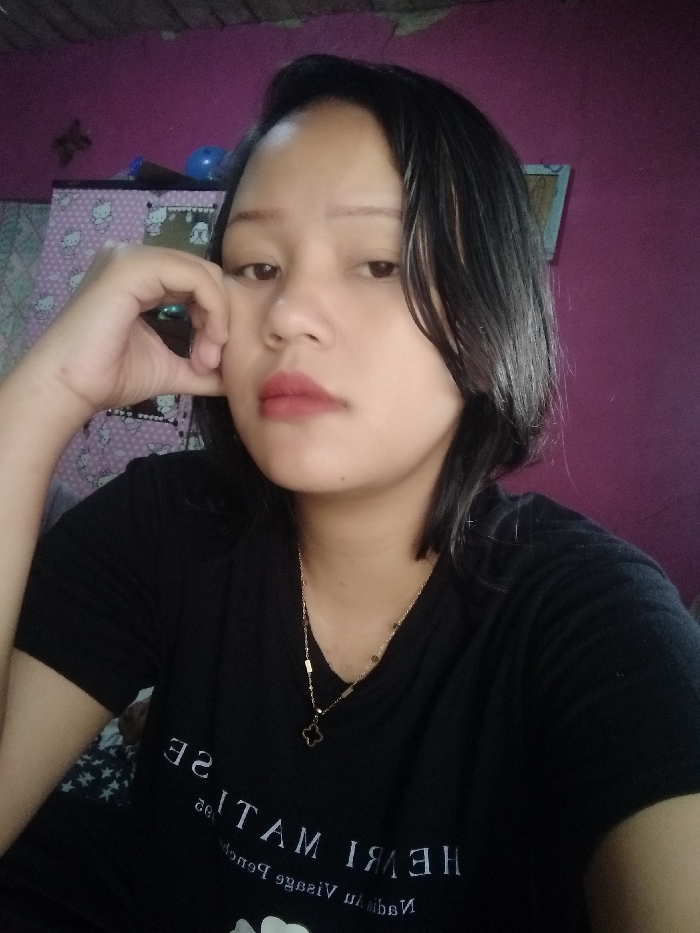 A woman with dark hair and a black t-shirt poses for a photo. Her head is tilted slightly as she rests her chin on her hand. She wears a gold necklace with a four-leaf clover pendant. The background features a pink wall and a shelf with various items, including a blue balloon and a patterned box or cabinet. The t-shirt appears to have white text written on it, although the words are mirrored.