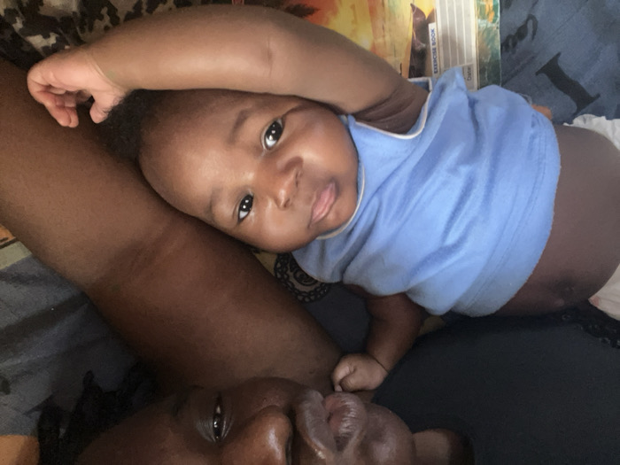 The image depicts two individuals, an adult and an infant, oriented diagonally within the frame. The location in the city of Kakau, Nigeria, cannot be determined from the visual information provided. The adult, with dark skin, occupies the upper right portion of the frame. Their head is visible, with closed or partially closed eyes and prominent lips, angled towards the infant. The adult's upper body is covered by dark fabric. The infant, also with dark skin, is positioned to the lower left of the adult, lying on their back. The infant wears a light blue sleeveless top with white trim and a white diaper or undergarment. The infant's head is turned towards the viewer, eyes open, with a neutral expression. The infant's right arm is bent, with the hand partially visible near the head. The two individuals are in close proximity, suggesting a personal interaction. The background consists of patterned fabric, likely bedding, in dark and earthy tones. Below the infant, an "EXERCISE BOOK" with a multi-colored cover (yellow, orange, blue, green) is partially visible. The lighting is diffused, illuminating the subjects from the front.