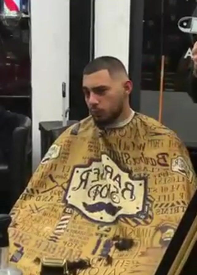 A man sits in a barber’s chair with a barber cape over him. He has short hair and a beard. He looks straight ahead with a neutral expression. A person holds a cell phone in front of him, appearing to take a picture of him in the mirror. The barber shop has a white wall, a black chair, and various barber tools. The cape has a pattern of words and images in tan and brown. A barber pole is visible through the doorway.