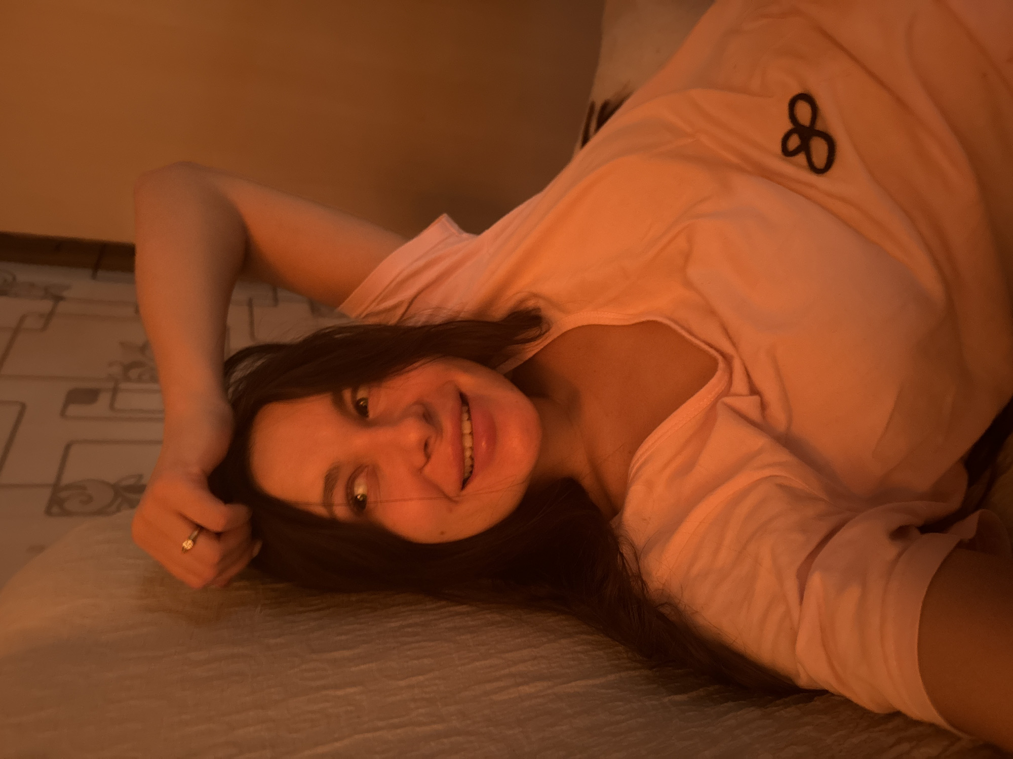 A woman with dark hair and fair skin is lying on a light-colored textured surface, possibly a bed. She is wearing a light pink t-shirt with a dark-colored, stylized knot emblem on the upper right side. She is smiling and looking at the camera. Her left hand is raised near her head, and a ring is visible on her finger. The lighting in the scene is warm and somewhat dim, giving an orange tint to the image. The location cannot be determined to be in Красный Маяк, Russia from the given information.