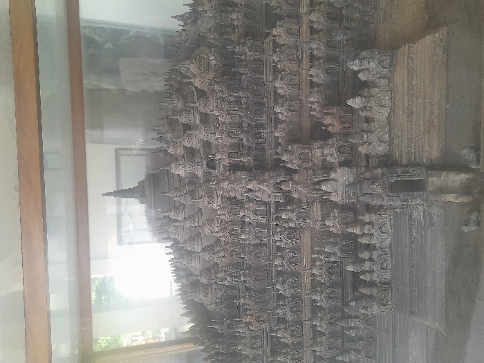 detailed model of a large Buddhist temple complex, possibly the Borobudur Temple, in a glass case