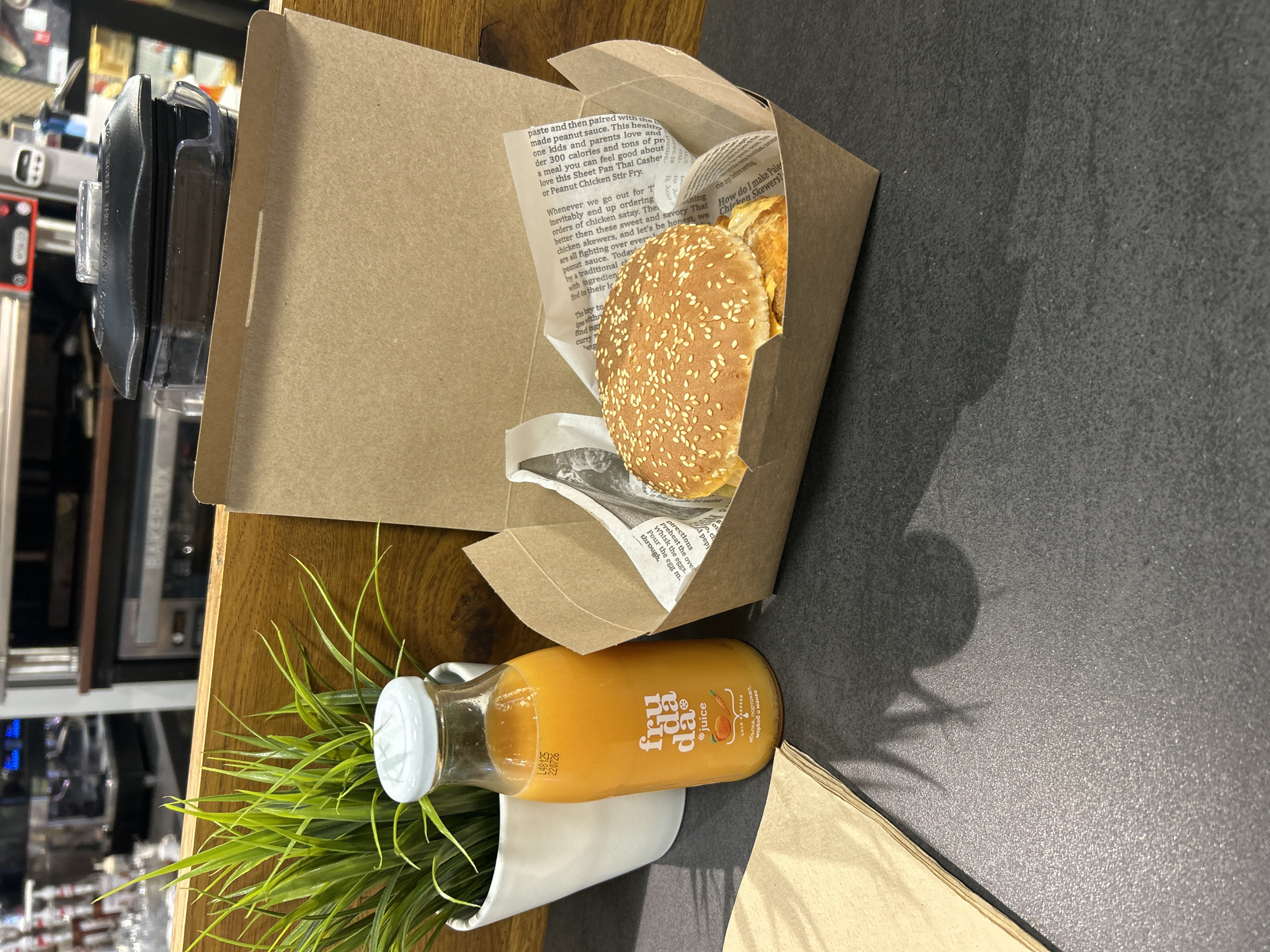 A medium shot depicts a burger in a cardboard container, a bottle of "fru da" juice, and a small plant, likely a decorative element. The burger is sesame-seeded and appears to contain a patty and other fillings. The juice is in a glass bottle with a white cap. The plant is in a white ceramic pot. The scene is set on a dark, possibly stone or tile, surface, which is likely a table. In the background, there is an out-of-focus view of what seems to be a cafe or restaurant setting with food preparation equipment. The scene is indoors, possibly in a cafe in Sofia, Bulgaria, indicated by the Bulgarian text on the juice bottle label.