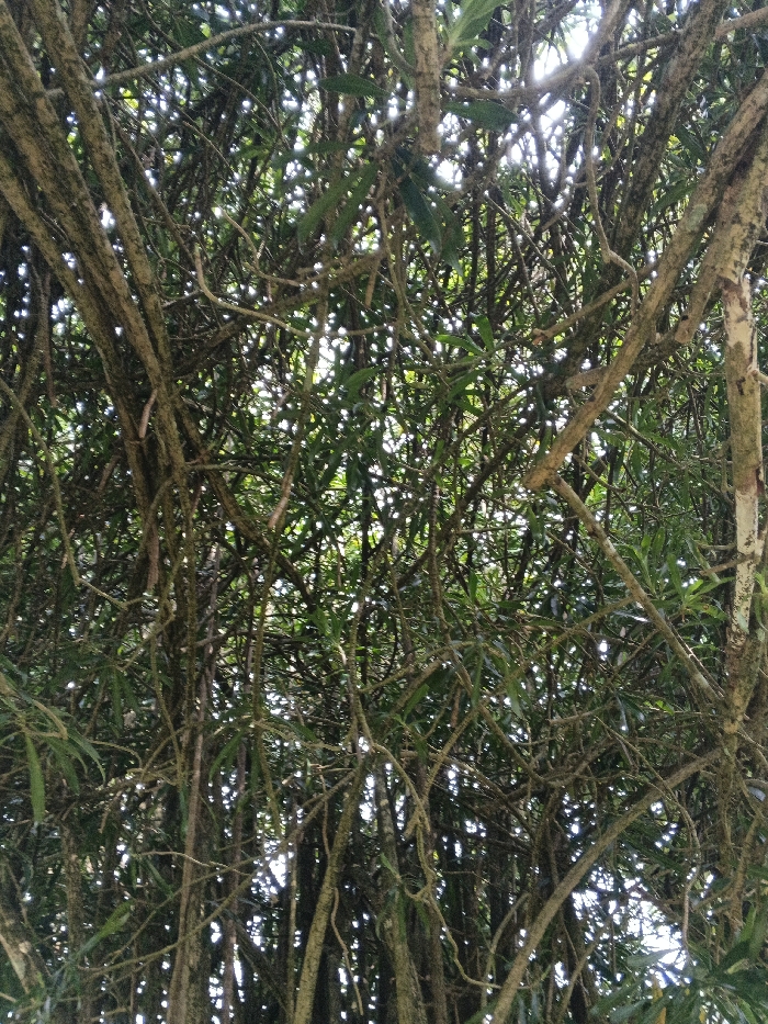 The image displays a dense canopy of intertwined tree branches and foliage, observed from below in Tamghas, Nepal