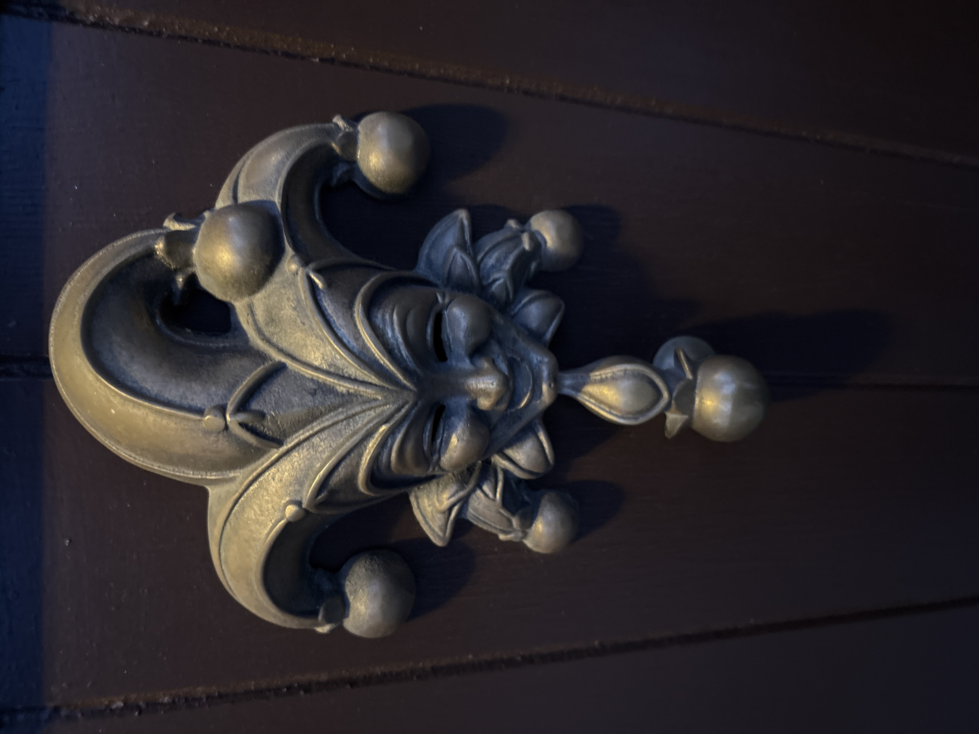 A three-dimensional jester-themed metal door knocker is affixed to a dark brown, vertically paneled wooden door