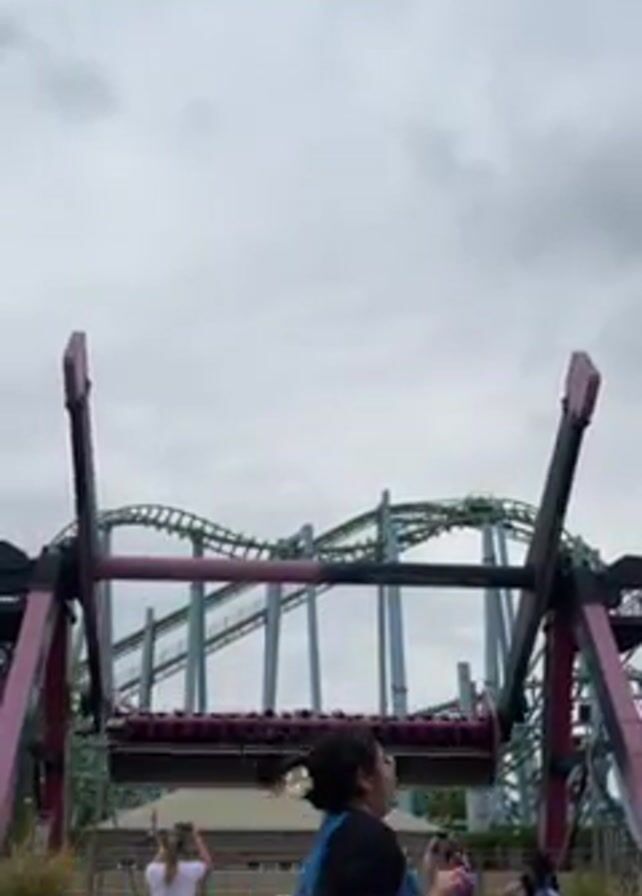 Four people stand behind a black fence, holding up their mobile phones, presumably to take photos or video. In front of them is a large amusement park ride with a long, horizontal, magenta-colored seating structure suspended between two arms. The seating structure is moving in a swinging motion. In the background is a roller coaster. The sky is overcast.