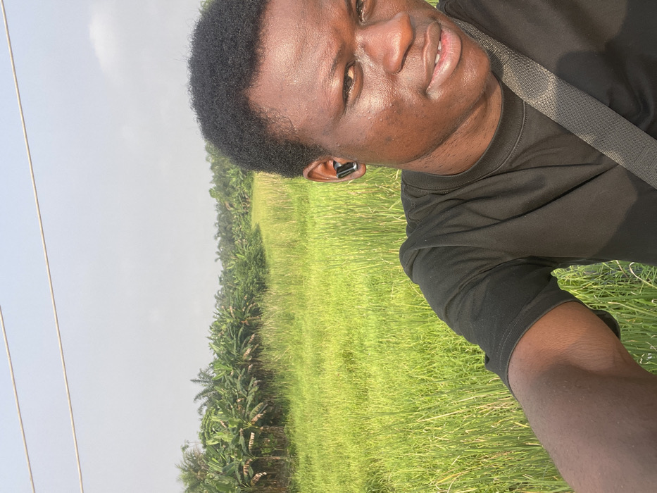 A dark-skinned male subject, estimated to be in his late teens or early twenties, with short black curly hair, takes a selfie in Itoga, Nigeria