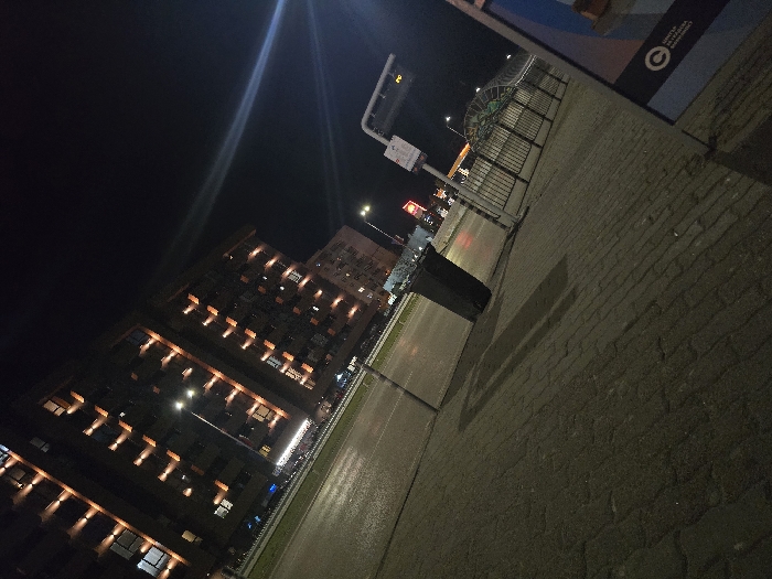 The image depicts an urban street scene at night in Sofia, Bulgaria, specifically near the University of National and World Economy. The perspective is tilted, looking diagonally across a paved sidewalk towards a multi-lane asphalt road and large buildings. In the left background, two multi-story buildings with modern architecture feature numerous illuminated windows and vertical strips of warm-toned facade lighting. A prominent streetlight stands between the road and the sidewalk, casting bright illumination on the immediate foreground. The asphalt road appears damp or reflective, suggesting recent precipitation. On the right side of the sidewalk, a dark, rectangular public trash bin is visible. Further right, a bus stop structure is partially captured, displaying a white sign with black text, a small digital display showing "24," and a blue and orange advertisement panel below it. The Bulgarian text "УНИВЕРСИТЕТ ЗА НАЦИОНАЛНО И СВЕТОВНО СТОПАНСТВО" is visible on the advertisement panel, identifying the location. Behind the bus stop, a dark metal fence with arched decorative elements encloses an area. Distant commercial lights, including a red neon sign, are visible further down the road. The sky is dark and clear. No individuals or vehicles are present in the observable scene. A diagonal blue lens flare is visible in the upper right quadrant of the image.