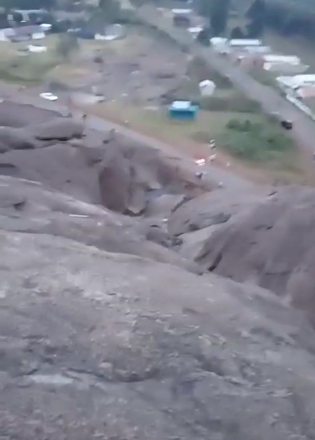 view from atop a large, grey rock formation looking down towards a road with a small community visible in the background. Several people are walking along the road, and a few are sitting near the edge of the rock formation. A white car and a motorcycle with its headlight on are also present on the road. The landscape includes scattered buildings, trees, and other vegetation. The lighting suggests it may be late afternoon or early evening.