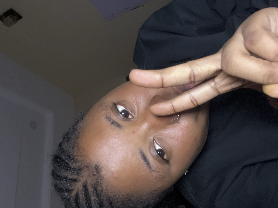 A person is depicted in a dimly lit indoor setting in Zango-ndaji, Nigeria. The subject, an individual with dark skin, is positioned with their head tilted slightly to the right, looking directly at the camera. Their dark hair is styled in braids. The right hand is raised, obscuring the lower portion of the face, specifically the nose and mouth. The index and middle fingers are extended in a V-shape, a peace sign, while the other fingers are folded. A small, silver-colored hoop nose ring is visible on the nostril. The subject wears a dark, long-sleeved top. The background consists of a light-colored ceiling with a recessed light fixture in the upper left, and dark, indistinct walls, with a vague rectangular object visible on the wall in the upper right.
