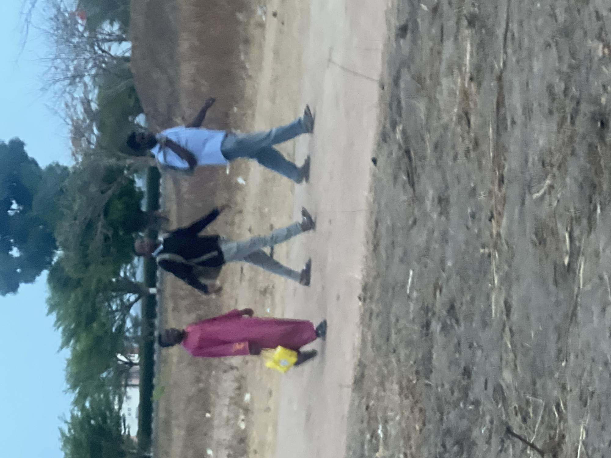 Three people are walking along a dirt path. The person in the front is wearing a long, pink garment and carrying a yellow bag. The second person is wearing a dark jacket with a light stripe on the sleeve and light-colored pants. The third person is wearing a light-colored shirt and light-colored pants. The environment appears to be an undeveloped area on the outskirts of Unknown, Nigeria. There are trees and shrubs on either side of the path, and the ground is dry and dusty. The sky is overcast.