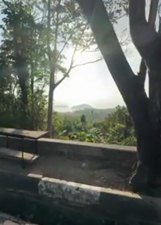 The camera pans from right to left across a lush, green landscape, revealing a distant body of water, likely the ocean, on the horizon. The sun shines brightly through the clouds and trees, casting a warm glow on the scene. A tree dominates the right foreground, its trunk partially obscuring the view. To the left, there is a concrete barrier and a simple bench. The environment appears to be a viewpoint or rest area on a hillside, with dense vegetation filling the space between the viewer and the distant sea. There are no people visible in the frame.