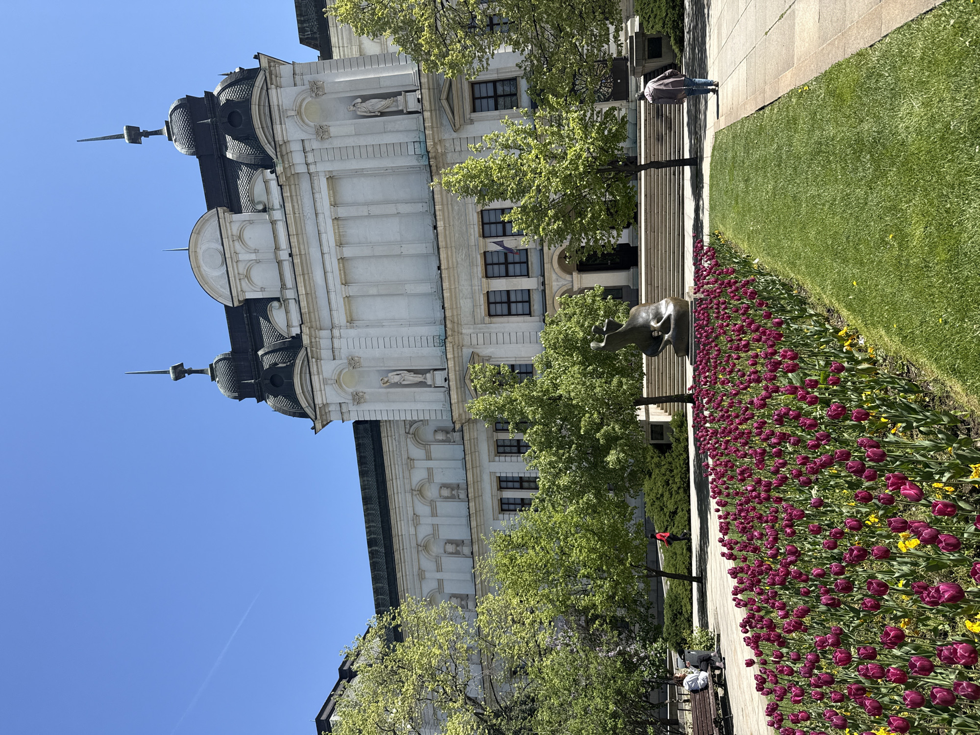 view of the National Art Gallery in Sofia, Bulgaria. The building is a large, white, multi-story structure with black domes and decorative statues on the facade. The sky is clear and blue. In the foreground, there is a flower bed with purple tulips and yellow flowers along a sidewalk. A bronze sculpture of a head stands near the sidewalk. A person is standing near a staircase, and a bench is visible beneath a tree. The scene appears to be taken on a sunny day, with lush green trees adding to the landscape.