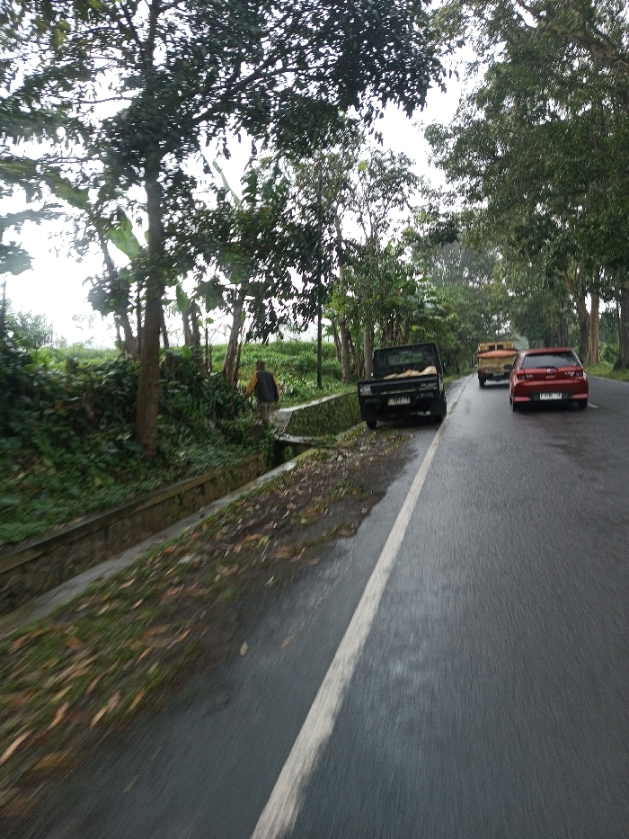 The scene depicts a wet, paved road in YonPhoogla, Bhutan, under overcast conditions. The image is captured from a forward-moving perspective. In the foreground, a dark asphalt road with a solid white line on its right edge is visibly wet, reflecting light. To the left of the road, a concrete drainage ditch runs parallel, beyond which an embankment is covered in dense green vegetation and numerous trees, including broad-leafed plants resembling banana trees. Scattered fallen leaves and debris are present on the ground next to the drainage ditch. In the midground, a single individual is visible on the left, walking away from the camera along the embankment's edge, wearing a light-colored top and dark pants. Adjacent to the road, a black pickup truck is parked on the shoulder, facing away from the camera. Further down the road in the background, a red sedan is observed in the right lane, followed by a light brown truck with a visible cargo bed. Both vehicles are moving away from the camera. The road continues to be lined by tall trees with dark green foliage under an overcast sky.