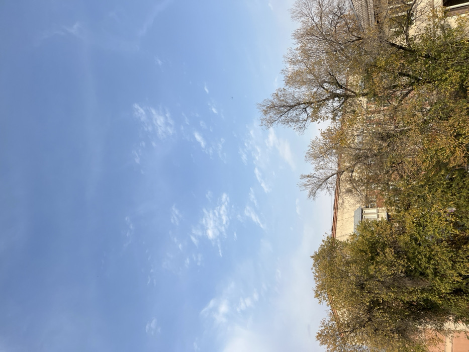 The image depicts an urban landscape in Bishkek City, Kyrgyzstan, captured during daylight. The upper two-thirds of the frame show a clear blue sky with scattered white, wispy clouds. A small dark speck, possibly a bird or insect, is visible in the upper central portion of the sky. The lower third of the image is dominated by a dense arrangement of deciduous trees in various stages of autumn foliage, ranging from full green-yellow leaves to largely bare branches. Behind and partially obscured by these trees, a large, light-colored building with a flat, reddish-brown trimmed roof line is visible. To the left, a light-colored bay window structure protrudes from another building, visible through the foliage. On the far right, a section of a building with a sloped, possibly tiled, roof is partially visible. No individuals or discernible actions are present in the scene.